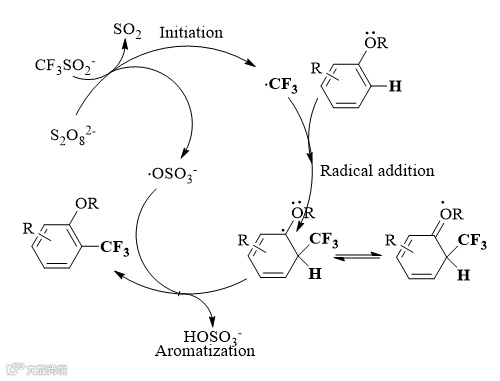 A:CF3SO2Na(Langlois试剂)作为一种常见的三氟甲基化试剂,具有价格便宜,稳定,易储存的优点。过硫化物作为一类常用的自由基引发剂,相比过氧化物而言,稳定性更好,更安全。目前已有许多使用TBHP等过氧化物引发自由基的报道,但过氧化物在受热条件下不稳定,对外界环境敏感,因此开发一种安全绿色的三氟甲基化方法显得尤为必要。因此,在初始选题的过程中,我们着重考虑能否在无金属且温和的条件下,使用CF3SO2Na作为三氟甲基源,实现芳香环三氟甲基化的方法。