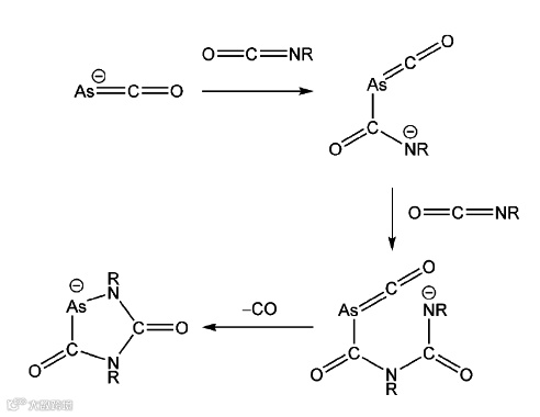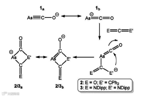 初步研究表明,和PCO-离子类似(Chem. Commun., 2014, 50, 11347),AsCO-显示出较高的环加成反应活性(Figure 5)。AsCO-可以与烯酮或者碳二亚胺化合物发生[2+2]环加成,生成相应的砷四元环化合物2和3(Figure 6)。Goicoechea教授推断该环加成和传统的狄尔斯-阿尔德协同环加成不同,属于分步环加成,涉及As负离子对不饱和碳的亲核进攻以及碳碳键形成。