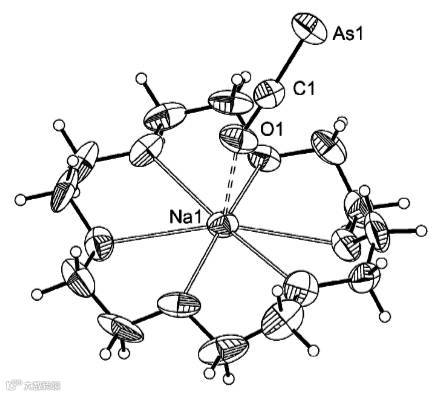 Goicoechea教授课题组借鉴以红磷来制备PCO-的合成路线,巧妙的批量制备了砷氰酸根的钠盐(Figure 3)。砷氰酸钠的晶体结构和理论预测的结构相差无几(Figure 4),As、C、O三个原子几乎处于一条直线(AsCO键角176.6°)。自然键轨道理论分析表明AsCO三个原子之间以As=C双键和C=O双键形式键合(键级分别为2.14和1.70),并且As和O原子电荷分别为-0.5和-0.6。