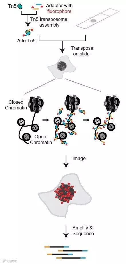 一直以来,研究者利用DNAse I酶切和高通量测序方法(DNase-Seq)揭示活跃染色质在基因组中的线性位置。但是这种方法需要百万以上的细胞以及大量的时间投入。近年来,斯坦福大学的 Dr. Howard Chang(張元豪教授)和Dr. Will Greenleaf 实验室利用转座子酶Tn5可共价键插入它的DNA接头到基因组中然后PCR扩增的特性,建立了ATAC-seq技术。此技术仅需要少于5万个细胞甚至单个细胞,且在~6个小时内完成活跃染色质文库的构建,因此该技术革命性的改进了活跃基因组测序方法。另外,研究者通常利用免疫染色的方法去探索活跃染色质在细胞核中的分布,但是这种策略通常受制于抗体的特异性而且不能很高通量测序同时进行。