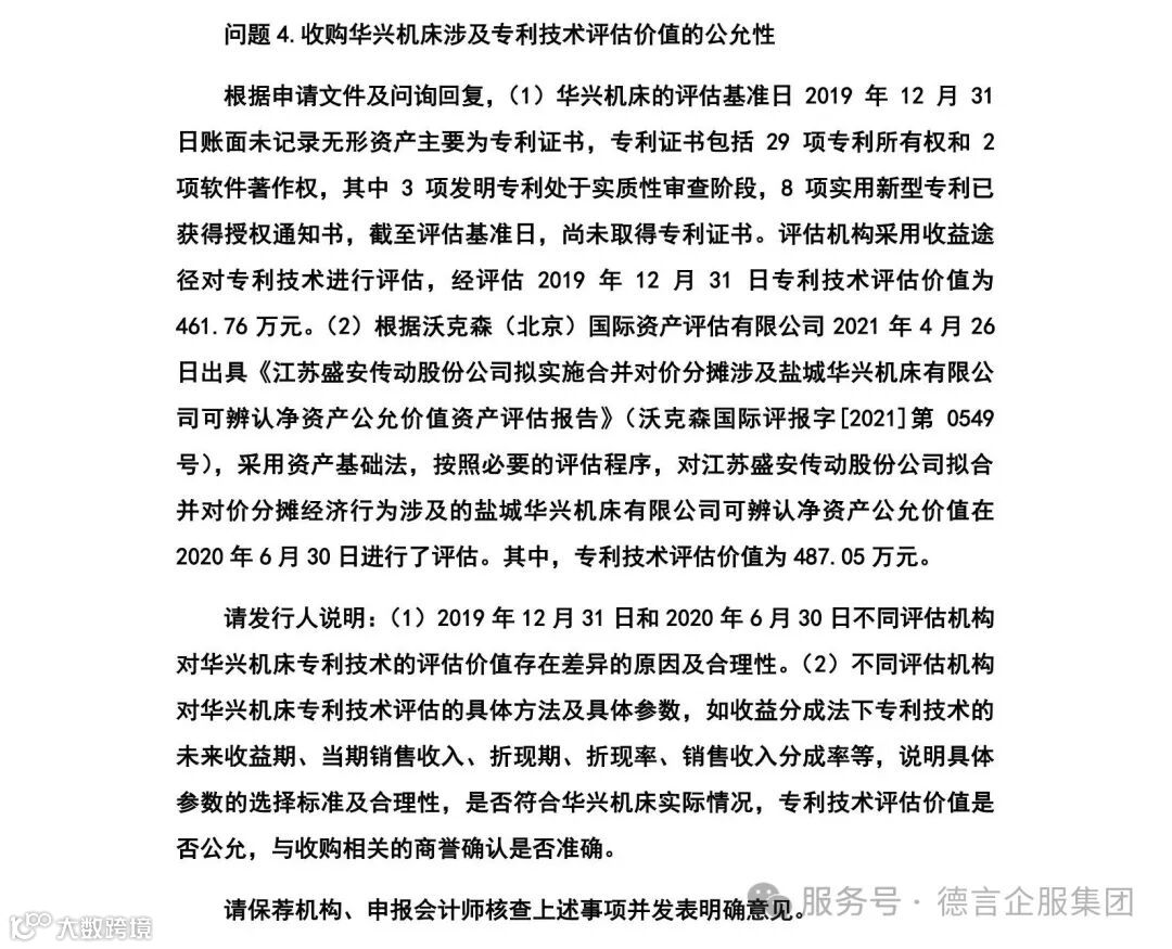 本次盛安传动IPO进程中审核问询问题中知识产权方面的主要问询点为3【收购华兴机床涉及专利技术评估价值的公允性】,上市委在二轮问询中重点问询了: