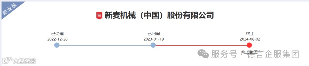 2024年8月2日,深交所公告,因新麦机械(中国)股份有限公司(以下简称“新麦机械”)撤回发行上市申请,根据相关规定,终止其首次公开发行股票并在创业板上市审核。