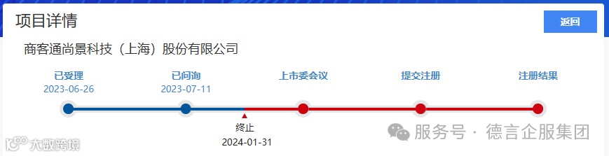 2024年2月2日,北交所公告,因商客通尚景科技(上海)股份有限公司(以下简称“商客通”)撤回发行上市申请,根据相关规定,终止其首次公开发行股票并在北交所上市审核。