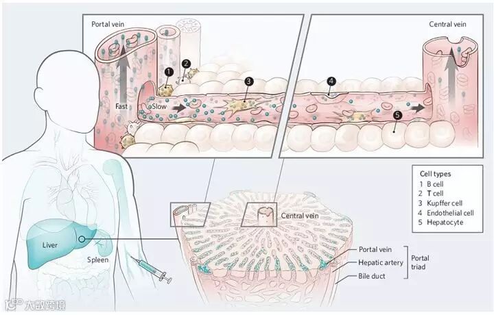 将纳米技术向临床转化所面临的一个重大问题是纳米粒子易在单核巨噬细胞系统(存在于肝、脾、骨髓中)内聚集,这不仅会阻碍足够量的纳米粒子运输至病灶部位,甚至还有产生毒性的隐患。因而弄清楚纳米粒子与单核巨噬细胞系统之间的作用将为加快纳米粒子在医学中的应用提供理论基础。Warren课题组发现当纳米粒子从外周血循环到肝时,它们的速度降低了1000倍,这使得纳米粒子充分与肝内细胞作用并逐步从血液中清除。纳米粒子沿着窦状隙有着明显的浓度梯度,从中央血管离开肝的纳米粒子的量小于从肝门进入的量。在肝门边缘处的B细胞和T细胞暴露于大量的纳米粒子下,而由于B细胞的吞噬能力高于T细胞,因此B细胞对纳米粒子的摄入量也高于T细胞。逃脱B细胞及T细胞吞噬的纳米粒子沿着窦状隙移动,接着与上皮细胞及Kupffer细胞作用。由于肝细胞与血管被一层有孔的上皮细胞隔离开,因而肝细胞几乎不摄入纳米粒子。部分未被内吞的纳米粒子由中央血管重新回到系统循环中,并最终再次返回到肝。这个过程反复进行,直到纳米粒子完全从血流中被清除。这一发现,为解决脱靶纳米材料在人体内的积累问题提供了理论上的指导。