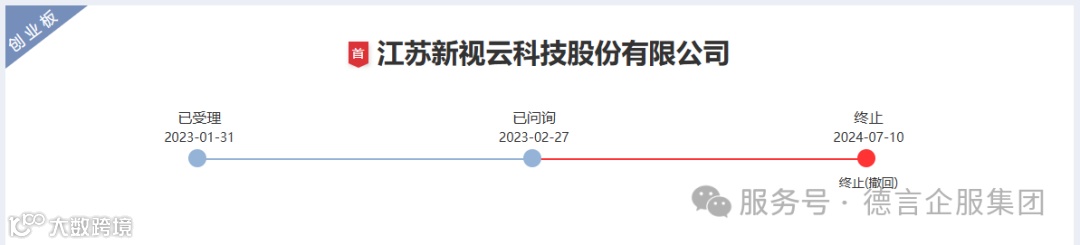 2024年7月10日,深交所公告,因江苏新视云科技股份有限公司(以下简称“新视云”)撤回发行上市申请,根据相关规定,终止其首次公开发行股票并在创业板上市审核。