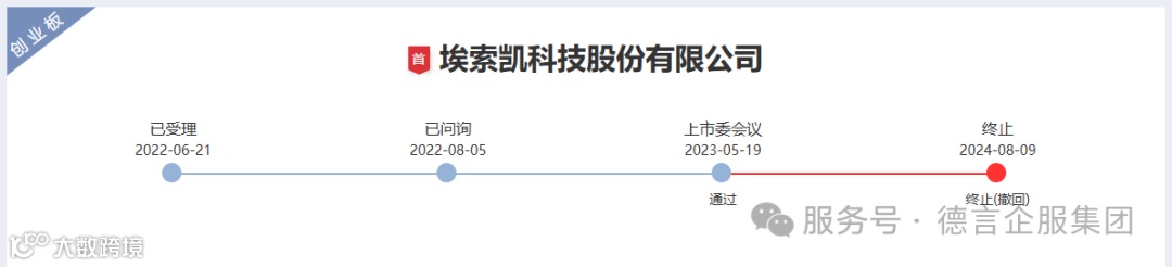 2024年8月9日,深交所公告,因埃索凯科技股份有限公司(以下简称“埃索凯”)撤回发行上市申请,根据相关规定,终止其首次公开发行股票并在创业板上市审核。