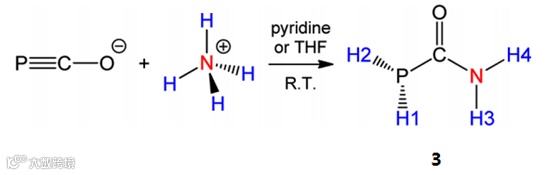 同年,牛津大学的Jose M. Goicoechea教授利用磷氰酸钾和铵盐NH4BPh4在吡啶或四氢呋喃里发生化学反应,制备了化合物3(Fig. 2, J. Am. Chem. Soc., 2013, 135, 19131-19134)。尿素的合成是人类历史上首个通过无机物制备有机物的例子。化合物3是尿素的磷类类似物,并且是非常少见的在空气中稳定的母体膦类化合物。