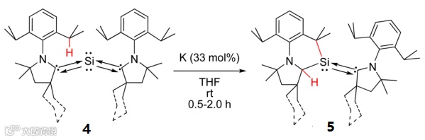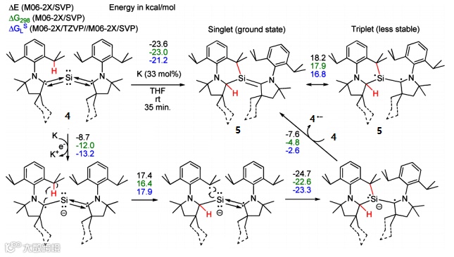 2014年,德国哥廷根大学著名的无机化学家Herbert W. Roesky教授用33 mol%金属钾还原双CAAC卡宾稳定的零价硅化合物4,随后C-H键对C-Si键进行加成,直接转变为单CAAC稳定的六圆环硅宾化合物5(Fig. 3, J. Am. Chem. Soc., 2014, 136, 16776-16779)。该反应中K作为电子的供体,仅提供一个电子,真正的催化剂是这一个“自由”的电子(Fig. 4)。