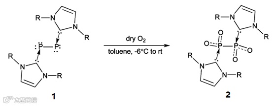 按时间顺序,先来看一下美国佐治亚大学Gregory H. Robinson教授在2013年的一篇磷化学的论文(J. Am. Chem. Soc., 2013, 135, 19139-19142),作者利用前期工作已经发表的化合物1,通入干燥的氧气,成功制备了化合物2(Fig. 1)。众所周知,四氧化二氮N2O4是二氧化氮NO2的二聚体。而化合物2是由两个NHC卡宾所稳定的P2O4化合物,也就是首例分离表征的四氧化二氮的磷类类似物。