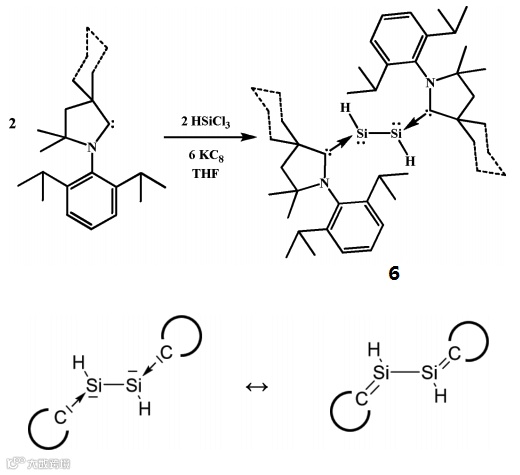 2016年,Roesky课题组又利用卡宾CAAC和HSiCl3在强还原剂KC8的作用下,成功制备了化合物6(Fig. 5, J. Am. Chem. Soc., 2016, 138, 10429-10432)。化合物6可以看作是两个CAAC卡宾和乙炔的硅元素类似物Si2H2的加合物。非常有意思的是,计算化学表明该化合物的两个共振形式对其电子结构的贡献几乎相等(Fig. 5, bottom),6既是卡宾稳定的Si2H2,也是硅杂1,3-丁二烯。