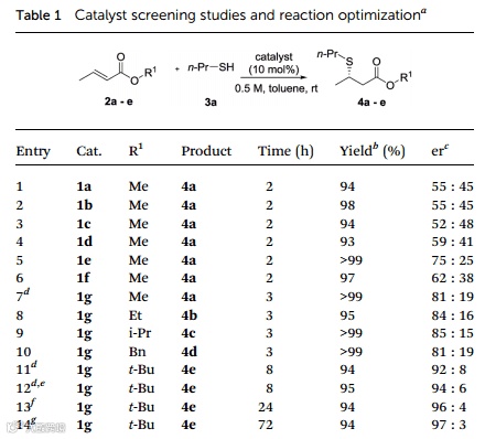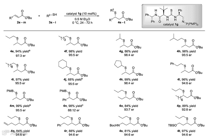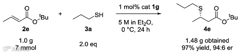 作者首先使用正丙基硫醇3a作为亲核试剂,对催化剂,巴豆酸烷基酯2的烷基部分等进行了筛选。通过筛选发现,当使用叔丁酯,以乙醚作为溶剂,催化剂1g表现出最好的催化结果(Figure 2)。