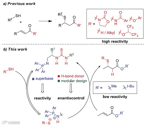 低活性的α,β-不饱和酯类底物如巴豆酸甲酯、肉桂酸甲酯等尽管商业可得、便宜且稳定,但却极少在有机小分子催化和金属催化中被化学家使用。与常规的Michael加成受体相比,它们位于迈尔亲电反应量表的底端。在有机小分子催化中,α,β-不饱和醛类和酮类等Michael受体可以通过亚胺离子很好的被活化,而这些惰性的α,β-不饱和酯类的活化却不能通过类似的模式进行。相比而言,这些酯类的衍生物如酰基吡咯、硫代酰胺、多氟烷基酯等,由于其活性明显提高,被研究的明显较多。到目前为止,还没有一例有机小分子催化的高对映选择性使用巴豆酸烷基酯或肉桂酸烷基酯的Michael加成反应见诸报道。或许可以这么说,该类底物在目前是有机小分子催化剂所难以企及的。一般而言,解决这类问题的方法有两个:(1)提高亲核共轭碱的浓度;(2)增加催化剂Brønsted碱的碱性。