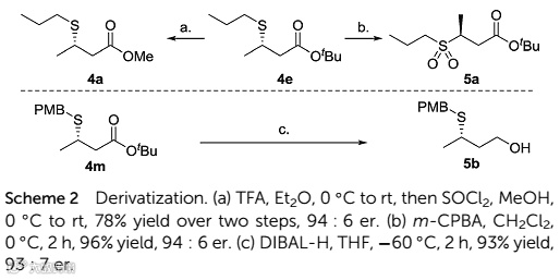 作者还对反应产物进行了一系列的衍生。产物4e首先通过水解为羧酸,在通过酯化反应,以两步78%的总收率得到甲酯衍生物。此外,产物4e中的硫醚键在氧化剂的存在下高收率的氧化为砜类化合物。产物4m中的叔丁酯也能在DIBAL-H还原条件下还原为醇(Scheme 2)。