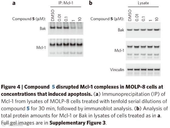 作者又选择细胞凋亡作为主要指标分别评价化合物对Mcl-1依赖型细胞和非依赖型细胞的作用。结果发现化合物5和11对上述两种不同类型的细胞诱导凋亡的作用完全不同。作者进而将化合物11加入到Bak沉默的NCI-H23细胞中,其活性显著下降。随后,作者通过免疫共沉淀手段证明了化合物11直接作用于Mcl-1-Bak蛋白复合物。至此,作者从蛋白水平和细胞水平上证明了化合物5、6、11对Mcl-1的靶向性。