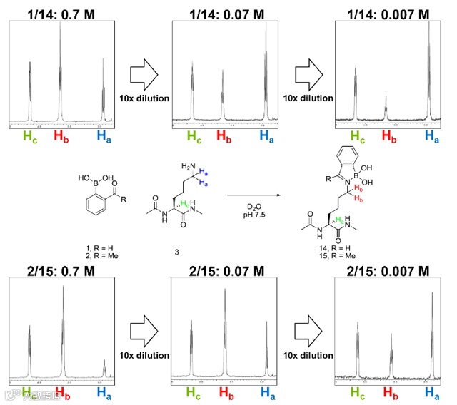 咱们就来看一下他们是如何层层深入完成这项研究的。作者首先分别用2-甲酰基苯硼酸(1)和2-乙酰基苯硼酸(2)与赖氨酸衍生物(3)在重水中混合,用1H-NMR监测共价键生成和断开的过程。