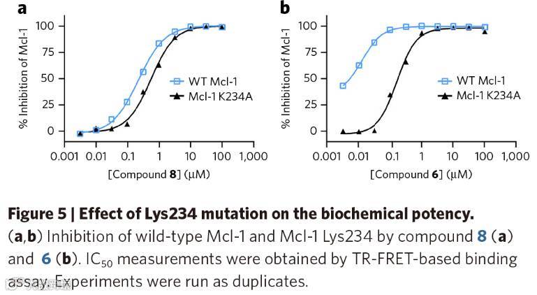 这个最精细的问题自然要放到最后解开谜底。验证方法也是生物化学的经典方法啦,把Mcl-1的Lys234突变成Ala234,即得到Mcl-1的K234A突变体。作者分别测定了化合物6和8对Mcl-1K234A的IC50,结果表明化合物6的活性显著降低。作者进一步利用质谱手段检测Mcl-1K234A与化合物5或6的复合物,没有检测到任何的共价修饰。这就和作者开始猜测的共价修饰位点完全吻合。