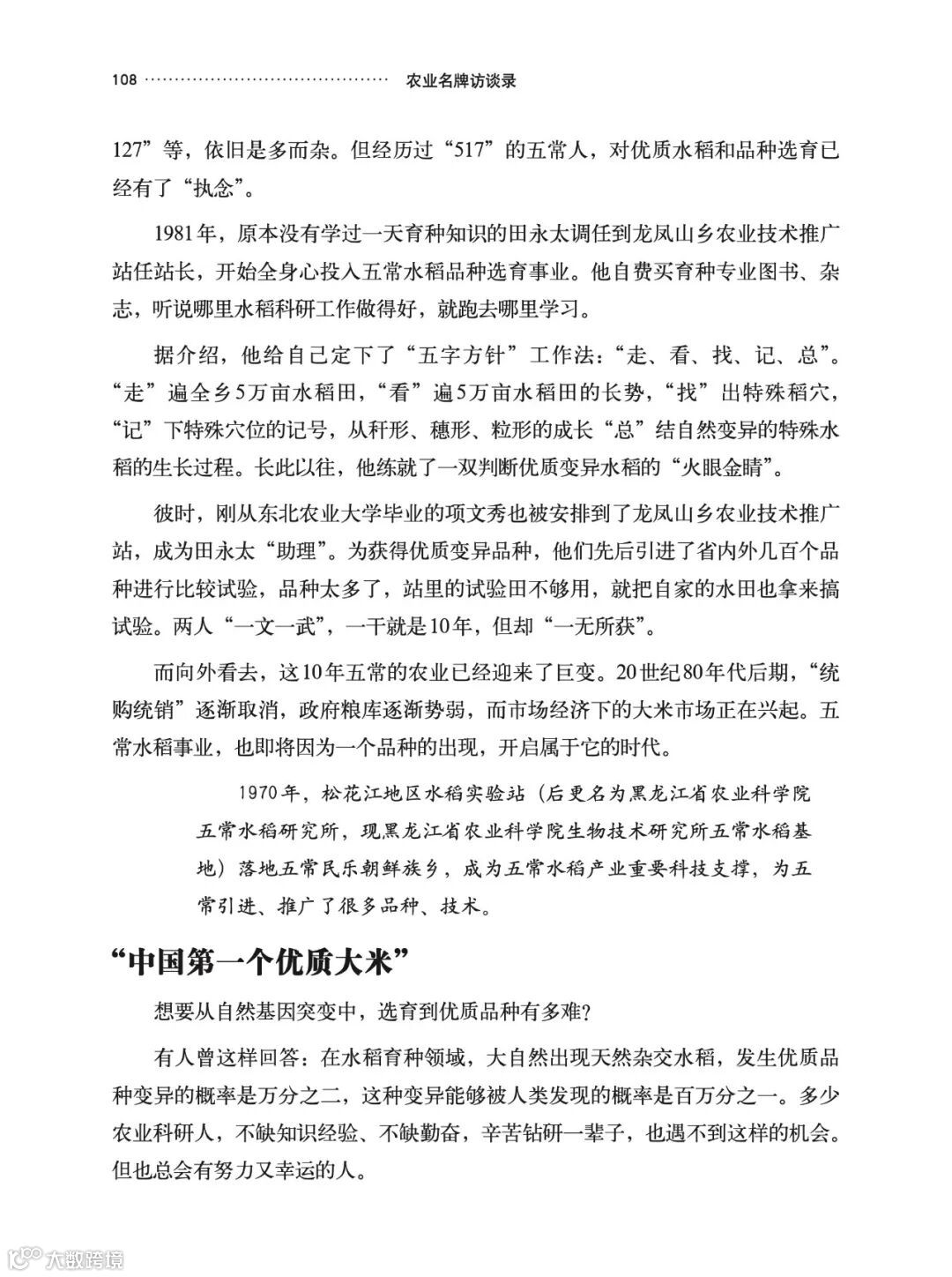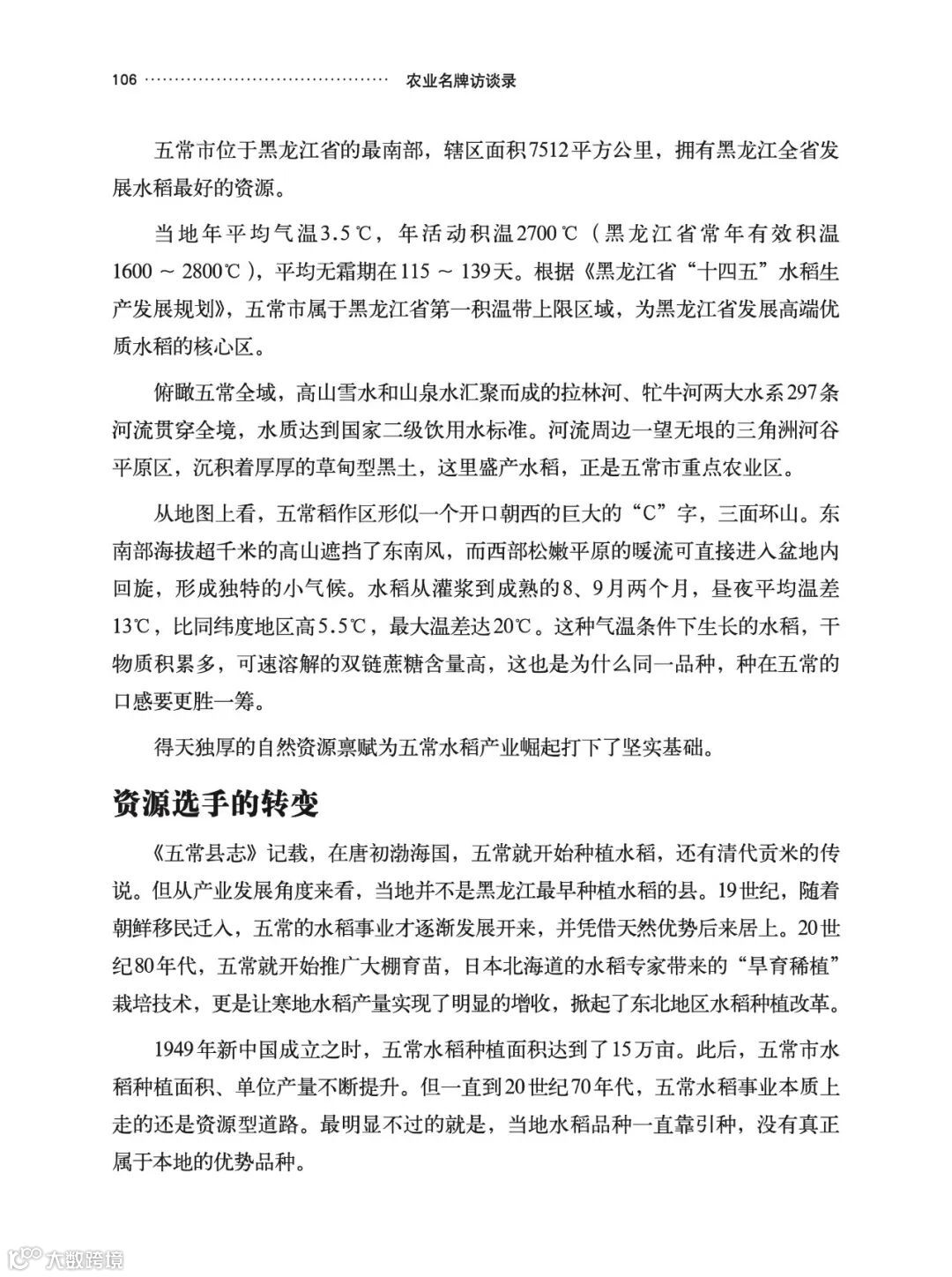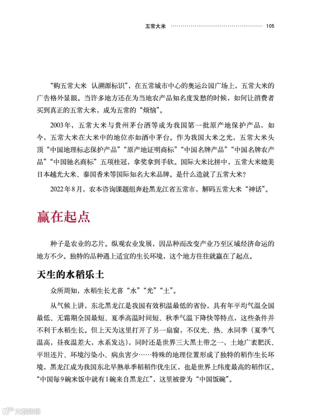“品种”是首要答案。品种是品质的根本性创新。我想吃过五常大米的人都会有这样一个印象——五常大米闻起来香,吃起来更香。这得益于一个叫“稻花香2号”的品种,这个品种的得来是自然对五常人的馈赠,更是五常人对品种创新的执着追求与辛苦付出。种子是农业的“芯片”,五常是一个因品种而改变命运的地方。当然一个好品种也需要在最适合它生长的地方才能最大化发挥出品种的优异特性,五常市种植水稻的自然禀赋十分优秀,肥沃而广袤的土地为五常大米的规模化发展打下了坚实的基础,这也是一个产业能发展壮大的关键因素之一。同时,可以发现五常大米产业发展遵循着新“三品一标”——“品种培优、品质提升、品牌打造和标准化生产”的发展逻辑,这是现代农业发展的重要方向,也是五常大米享誉全国的重要秘诀。