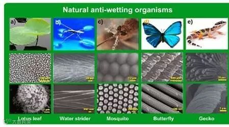 自然界中,许多植物与昆虫拥有着超疏水的表面。例如,Barthlott和Neinhuis发现的“莲叶效应”,即莲叶的超疏水和自清洁功能来源于微米和纳米级的粗糙表面结构(毛状体、表皮折叠和蜡晶体),以及上表皮蜡的疏水性质。科学家们通过研究生物体表面的超疏水性的形成机理,仿生制备出超疏水界面材料,并将其自清洁功能应用于多个领域。例如,用超疏水材料修饰丝织品,可防水防污;涂在轮船外壳可以防腐防污;用于石油运输管道上可以防止油滴粘附从而减少消耗。