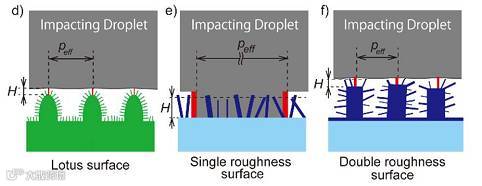 为什么拥有同样接触角与滑动角的不同表面,水滴弹跳能力有如此大的差异呢?为了解释这个现象,他们引入了Laplace压力PL和动态压力Pd,前者代表抑制浸润的数值,与材料表面结构性质相关,而后者则代表推动力数值,与液滴的冲击力相关。当PL>Pd时,会发生水滴弹跳现象。由于表面结构的无规则性,他们采用ρeff(垂直站立的晶体间的有效间距)来估算PL的数值,而ρeff可以从电镜图上粗略估读。结果他们发现在单粗糙表面,ρeff > 500 μm,此时PL<Pd;而在双粗糙表面及莲叶上,ρeff分别是35 μm和20 μm,此时PL>Pd。由此可以解释上述现象。