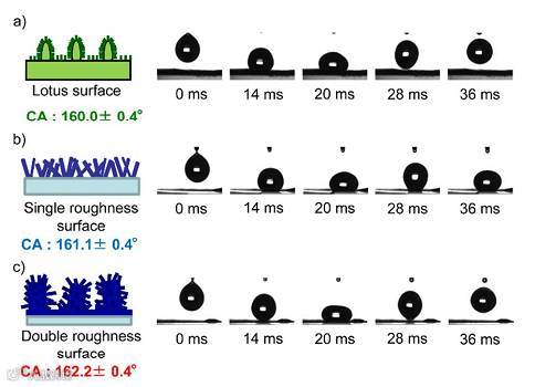 接下来,科研人员在莲叶表面、单粗糙表面及双粗糙面对水滴弹跳能力做了考察,这对材料的自清洁功能有着重要的影响。他们发现只有在莲叶表面及双粗糙表面能观察到水滴弹跳现象,而在拥有相同接触角与滑动角的单粗糙表面却没有观察到该现象。