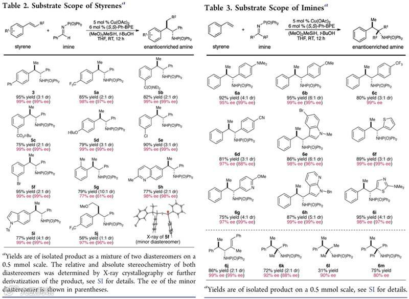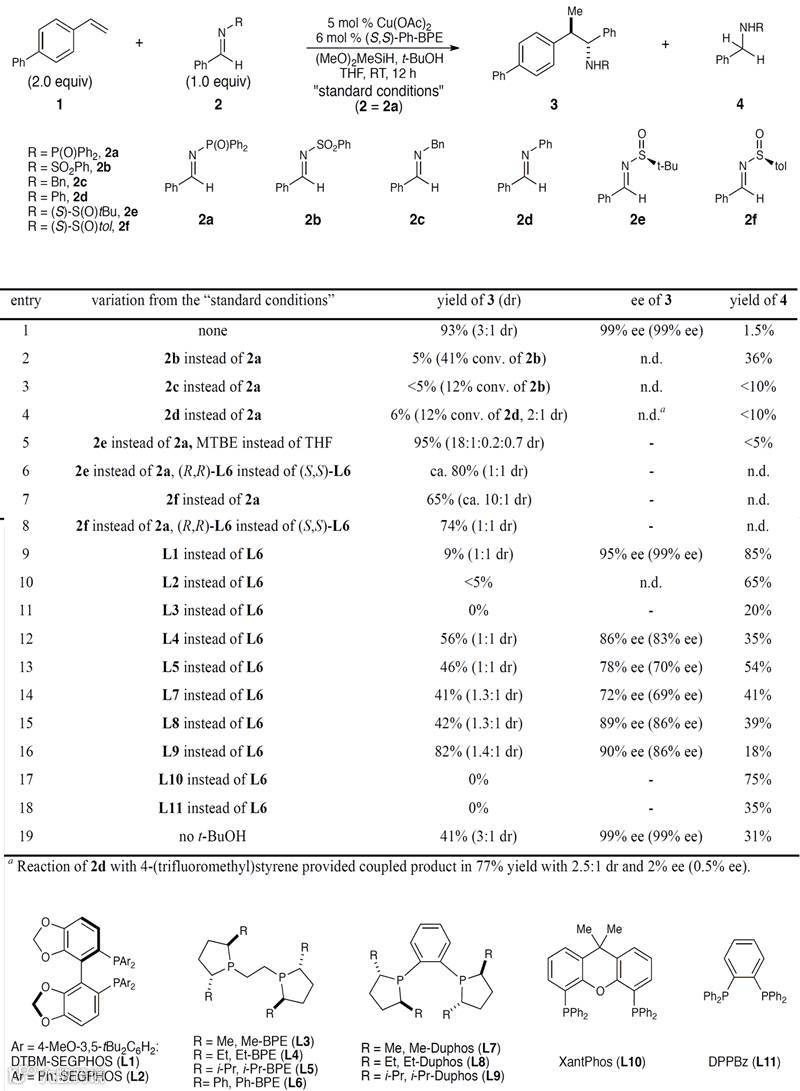 在Science工作的基础上,通过一系列的配体对比和亚胺受体的筛选,很快确定了最优条件:5mol% Cu(OAc)2,6 mol% (S,S)-Ph-BPE,(MeO)2MeSiH (5 equiv),t-BuOH (2 equiv),THF(0.5 mL),室温,12小时,就能以93%的总收率和3:1的非对映异构比(dr)得到产物3,两种异构体的对映异构比(ee)都高达99%,而亚胺氢化产物4只有1.5%。与上月Science上报道的催化体系基本没有区别,仅仅是溶剂由环己烷变为了四氢呋喃。