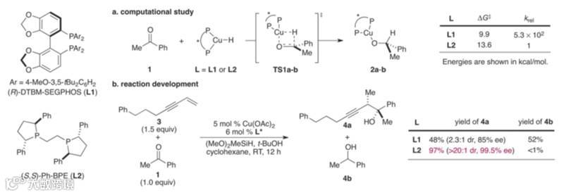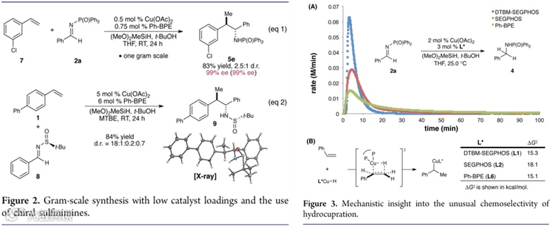 最后,作者对反应机理进行了再探究,为什么恰恰是Ph-BPE配体具有好的化学选择性?作者以Cu催化下的亚磺酰亚胺的硅氢还原化反应速率为切入点来解释了这一现象。从动力学数据可以看到(图5,Figure 3 A),与DTBM-SEGPHOS和SEGPHOS相比,Ph-BPE作配体时亚胺的还原速率更慢。同时理论计算结果表明(图5,Figure 3 B),Ph-BPE作配体时,苯乙烯的铜氢化活化能与DTBM-SEGPHOS配体表现差不多;但与SEGPHOS相比,Ph-BPE作配体时的铜氢化反应速率要快大约1800倍。综合这两点就很好的解释了Ph-BPE在该反应中所表现出的独特化学选择性。