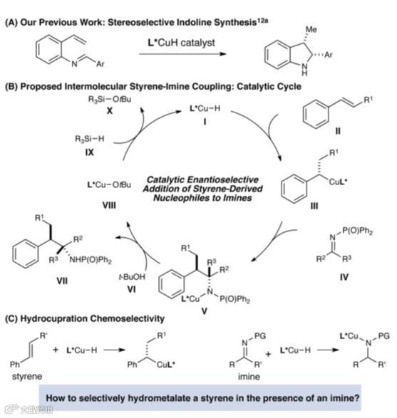 在本次报道中,作者基于前期工作,将苯乙烯和亚胺引入催化体系,设计了新的反应路径(图2 B)。首先是Si-H与Cu催化剂原位形成L*Cu-H试剂Ⅰ,然后烯烃插入形成碳亲核中间体Ⅲ,该中间体对亚胺Ⅳ亲核加成生成Ⅴ,然后被质子氢淬灭游离出产物Ⅶ,同时催化剂再生完成一个催化循环。按照该设计,反应的难点在于L*Cu-H试剂Ⅰ对苯乙烯和亚胺的化学选择性(图2 C)。