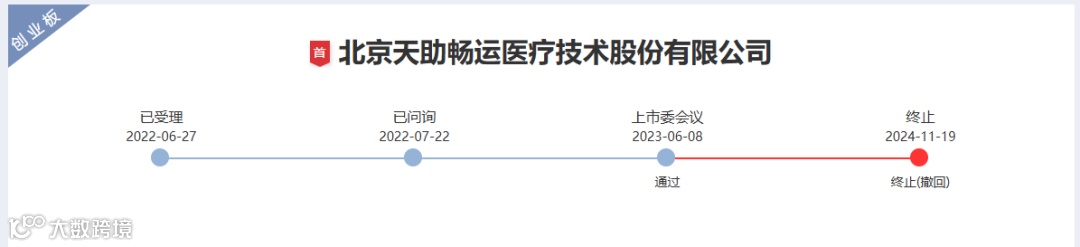 2024年11月28日,深交所公告,因北京天助畅运医疗技术股份有限公司(以下简称“天助畅运”)撤回发行上市申请,根据相关规定,终止其首次公开发行股票并在创业板上市审核。