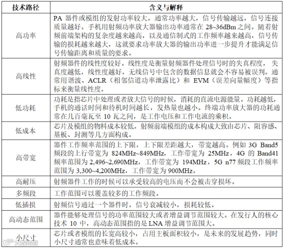 射频前端芯片行业的技术路径具体可以归纳为高功率、高线性、低功耗、低成本、高带宽、高耐压、多频段、低插损、高动态范围和小尺寸等。具体含义如下: