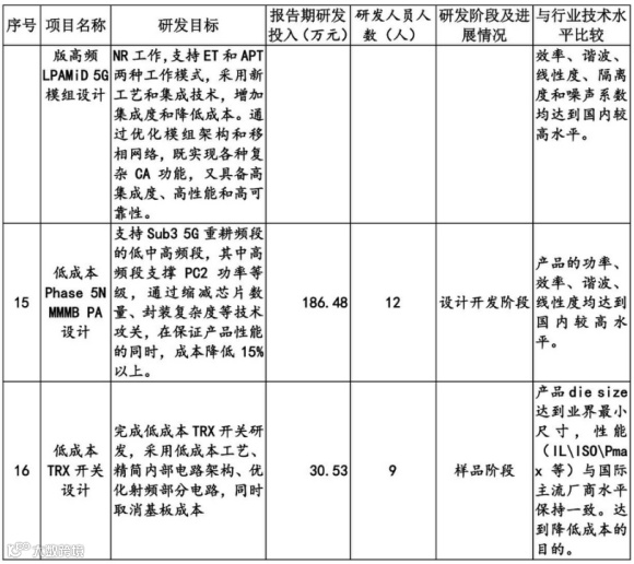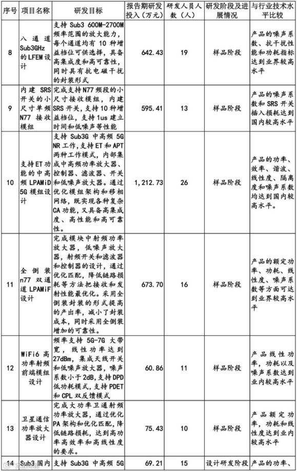如上表所示,相较于同行业公司Skyworks、唯捷创芯和慧智微的同类型产品,公司主要产品5G Sub6双频L-PAMiF、4G Phase II MMMB的技术参数互有高低或基本持平,公司主要产品在性能参数上与国内、国际厂商处于同一水平。除此之外,发行人5G Sub6单频L-PAMiF和4G Phase II TxM产品由于国内厂商并未披露, 故无法进行比较。