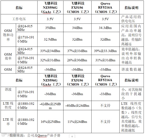 发行人GaAs工艺和CMOS工艺的4G Phase II TxM产品与国际主要厂商Qorvo的性能对比情况如下: