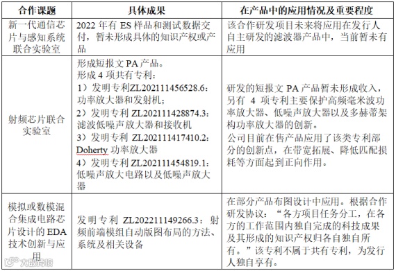 片联合实验室 ”形成的4项共有专利主要保护发行人未来在毫米波领域的技术布局,其部分创新点在当前在售产品中主要在带宽拓展、降低匹配损耗等方面起到了一定的正向作用;“模拟或数模混合集成电路芯片设计的EDA技术创新与应用 ”形成的发行人自有的专利在部分产品布图设计中应用;除此之外,其他的合作研发成果尚未应用在公司的主营业务中。上述合作研发成果对发行人当前主营业务的重要程度较低,同时根据发行人与合作方签订的合作研发协议,发行人能够对合作研发成果进行合法使用。
