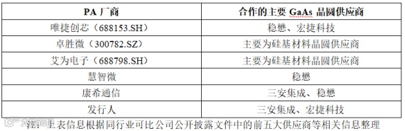 根据同行业公司披露的公开文件,国内主要PA厂商合作的GaAs晶圆供应商主要为境外企业。除发行人和康希通信外,未有其他同行业PA厂商披露其主要供应商中有国产GaAs晶圆代工厂的情形。康希通信与发行人相比采购金额较小,且不涉及5G射频前端器件。具体情况如下:
