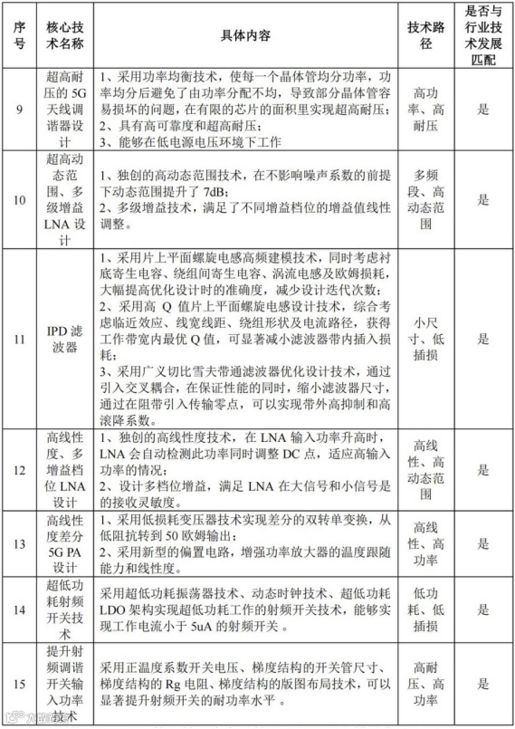 公司已形成“超低静态电流高线性PA设计 ”、“应用于5G通信的包络跟踪PA的设计技术 ”等15项具有自主知识产权的核心技术。报告期内,公司核心技术形成的产品收入占主营业务收入的比例为100.00%。