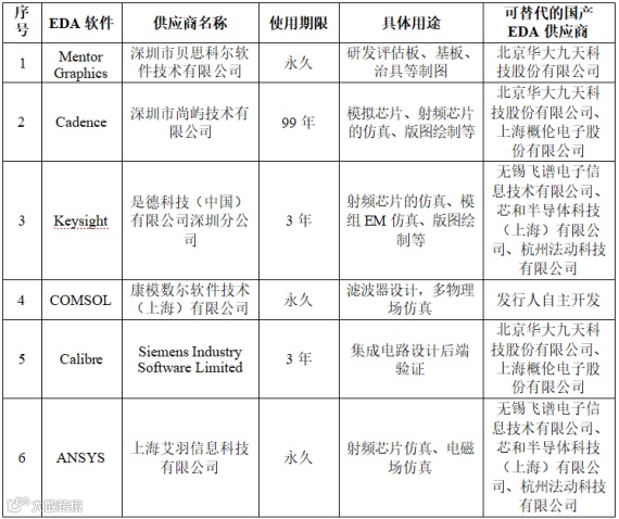 此外,目前EDA软件细分市场较为成熟,同一类别软件存在国内本土备选供应商,包括上海概伦电子股份有限公司、北京华大九天科技股份有限公司、无锡飞谱电子信息技术有限公司、芯和半导体科技(上海)有限公司、杭州法动科技有限公司等,供应商互相之间具有可替代性,单一供货商的断供不会对企业从其他供应商处获取EDA软件造成障碍。发行人更换并适应新的供应商可能会对研发验证周期造成一定滞后影响,但不会造成重大不利影响或导致业务发展受到严重阻碍。