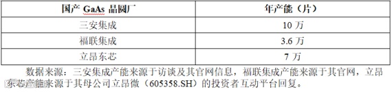 当前,具备GaAs射频前端芯片生产能力的国产晶圆厂的产能情况如下: