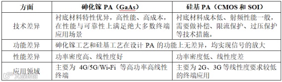1、砷化镓 PA(GaAs)、硅基 PA(CMOS 和 SOI)在技术、功能、性能、应用领域等方面的区别,公司各产品采用的工艺方案