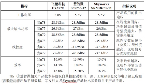 根据公司的主要产品线分布,考虑数据的公开可获得性,公司选择国际厂商Skyworks公开披露的产品手册性能数据,以及国内厂商慧智微、唯捷创芯披露的数据作为对比参考,选择相似应用场景下的同一类型射频前端模组型号,并依据行业惯例选择射频前端领域关键核心性能指标进行比对,具体如下: