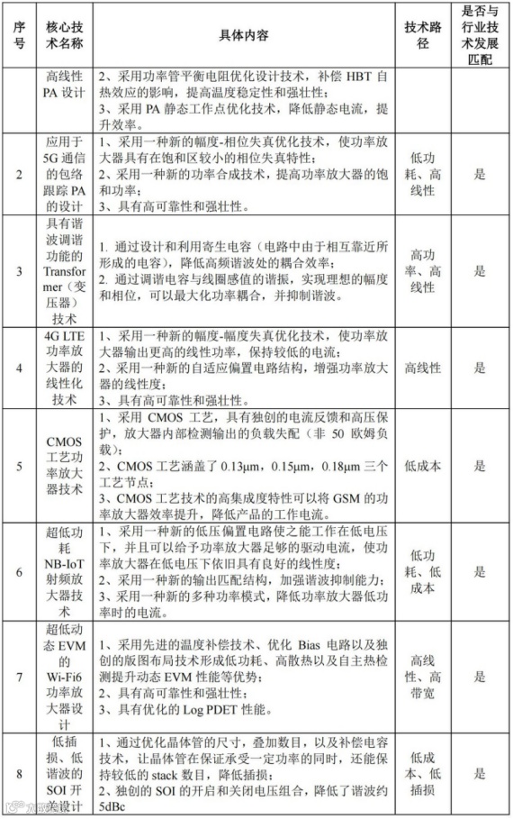 根据申报材料:(1)公司是全球少数同时具有砷化镓 PA(GaAs)设计能力和硅基PA(CMOS和SOI)设计能力的射频芯片厂商之一,公司最早在国产GaAs工艺平台量产5G射频前端器件,也是目前采用国产GaAs工艺出货量最多的国内射频前端公司;(2)公司2G/3G/4G产品逐渐采用CMOS工艺替换较为昂贵的GaAs工艺;(3)公司拥有超低静态电流高线性PA设计等11项核心技术,招股说明书披露了公司部分产品与Skyworks或Qorvo对应产品的性能指标对比情况;(4)报告期内公司与中国科学院微电子研究所、芯和半导体等存在合作研发的情形,公司存在 2 项与华南理工大学的共有专利、1 项知识产权质押;(5)公司采购Keysight EDA软件License,公司未披露在研项目的相应人员。