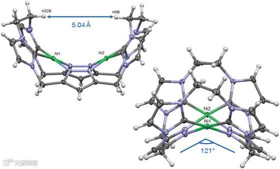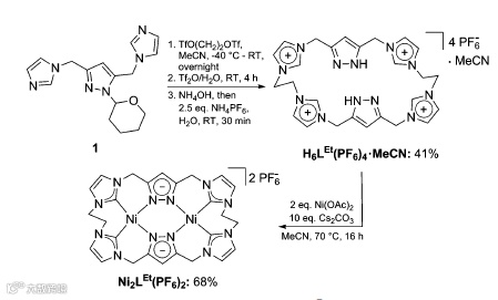 该组之前在Chemical Communications报道过如下图中环状主体(Chem. Commun., 2016, 52, 9089),镍离子可以与咪唑环上的C和吡唑环上的N配位形成类似碗状的主体,这种主体可以结合Cl-、Br-形成二聚物。