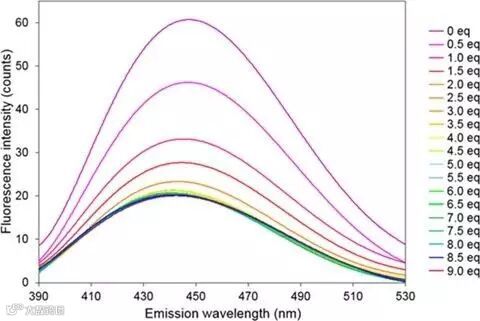 图8. 发光猝灭实验. (142 μM, H2O, λex= 335 nm, λem = 445 nm) 。图片来源:JACS