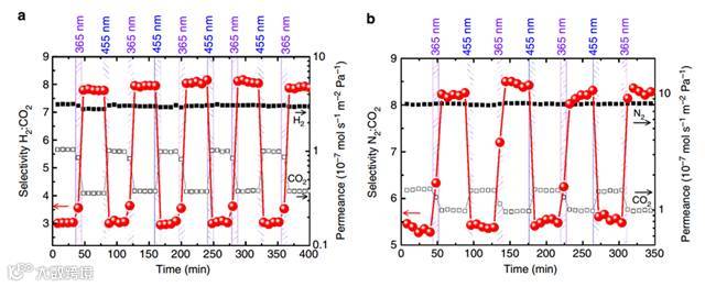 研究团队将该MOFs分离膜用于H2/CO2混合气体的分离,并对其渗透性、分离系数等参数的光响应性进行了系统的测试。统计结果表明:该分离膜其分离特性具有良好的光控性和(可逆)循环稳定性;其H2/CO2混合气体的分离系数能够通过不同的光照条件在3~8之间进行精确调控。