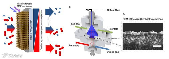 近日,德国卡尔斯鲁厄理工学院(KIT)的Lars Heinke、Zhengbang Wang和汉诺威大学的Alexander Knebel等人在Nature Communications上报道了他们的新进展,通过在MOFs结构中引入光响应性的偶氮苯基团,制备了可远程光调控(分子)渗透性的智能分离膜。