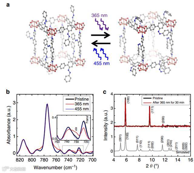 作者制备的SURMOF(surface-mounted MOFs)为柱撑层状结构(pillared-layer structure),含偶氮苯基团作为侧链接到MOF结构中。红外反射光谱(IRRAS)和UV-Vis吸收光谱测试表明,连接在MOFs结构上的偶氮苯基团在紫外光(365 nm)/可见光(455 nm)的照射下能够发生可逆的顺反异构化;而且X射线衍射测试表明,紫外/可见光的循环照射,对MOFs的框架结构没有产生明显的影响。