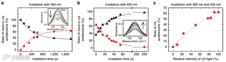 SURMOF结构中偶氮苯基团顺式/反式状态含量的调控。图片来源:Nat. Commun.