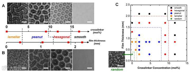 此外,聚合体系表面自褶皱的图案的形貌能够通过体系中交联剂浓度、膜厚等参数进行精确调控,从而获得六方点状、花生状、迷宫状等一系列褶皱形貌。