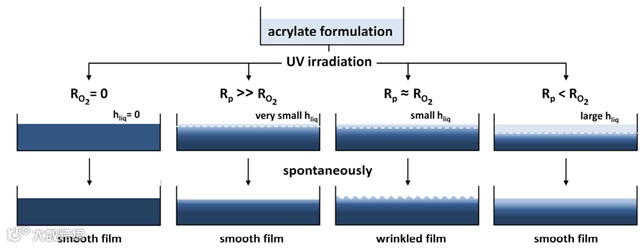 同时,研究进一步表明当单体聚合速率过快时(氮气氛围),其表面也不能发生自褶皱现象。只有当单体的聚合速率(Rp)和氧气的阻聚速率(Ro2)达到一个平衡时,聚合体系表面才能发生自褶皱现象。