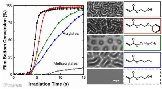 不同单体的聚合速率(动力学)及其光固化后聚合物表面形貌。图片来源:Polym. Chem.