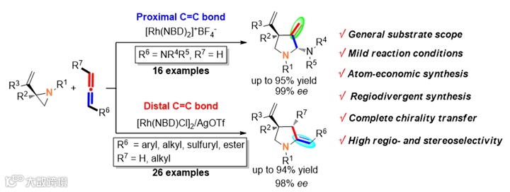 最近,华东师范大学张俊良教授研究团队的冯见君博士(校晨晖学者)等通过对一价铑与烯基氮杂环丙烷氧化加成生成的铑-氮杂四元环中间体的捕捉,分别发展了烯基氮杂环丙烷与炔或烯的分子内杂[5+2]环加成反应;烯基氮杂环丙烷与炔的分子间[3+2]和[5+2]环加成反应的调控以及烯基氮杂环丙烷与共轭双烯的[3+4]环加成反应。近日,该小组还成功地实现了铑催化烯基氮杂环丙烷与联烯类底物的区域选择性分子间[3+2]环加成反应,并通过“手性转移”策略立体专一性的制备了手性2-或3-亚甲基吡咯烷化合物。该工作发表在《Angew. Chem. Int. Ed.》上,由第一作者——林桃燕与通讯作者——冯见君博士和张俊良教授共同完成。