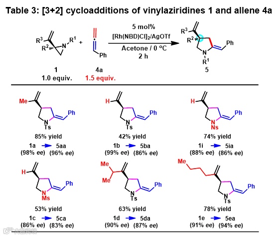 在最优条件B下,作者还固定联烯4a作为底物,对一系列烯基氮杂环丙烷底物的兼容性进行考察。如Table 3所示,各种类型的烯基氮杂环丙烷1a-1e和1i在该催化体系下都兼容。